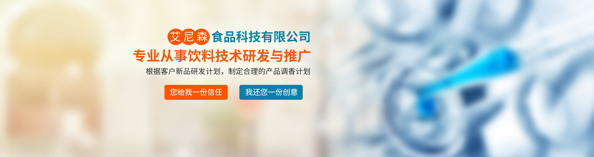 廊坊市艾尼森食品科技公司是一家專業(yè)從事飲料技術(shù)研發(fā)與推廣的公司,公司業(yè)務(wù)主要包括食品飲料技術(shù)咨詢與服務(wù)、產(chǎn)品定位與現(xiàn)有產(chǎn)品品質(zhì)改進(jìn)、新產(chǎn)品技術(shù)工藝研發(fā)等。公司坐落于京津冀核心地帶--廊坊市,位置得天獨厚,現(xiàn)與京津多家研究所形成戰(zhàn)略合作關(guān)系,為多家上市公司及知名企業(yè)提供技術(shù)支持與原材料供應(yīng)。